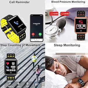 - 【Monitoring】: By induction of movement changes under skin, the green light can automatically record and calculate heart rate/blood pressure/blood oxygen monitoring data and record the data in app. The watch also can monitor your sleep duration, sleep quality and record deep light sleep. You can check your sleep tendency via APP, thus improving sleep quality.